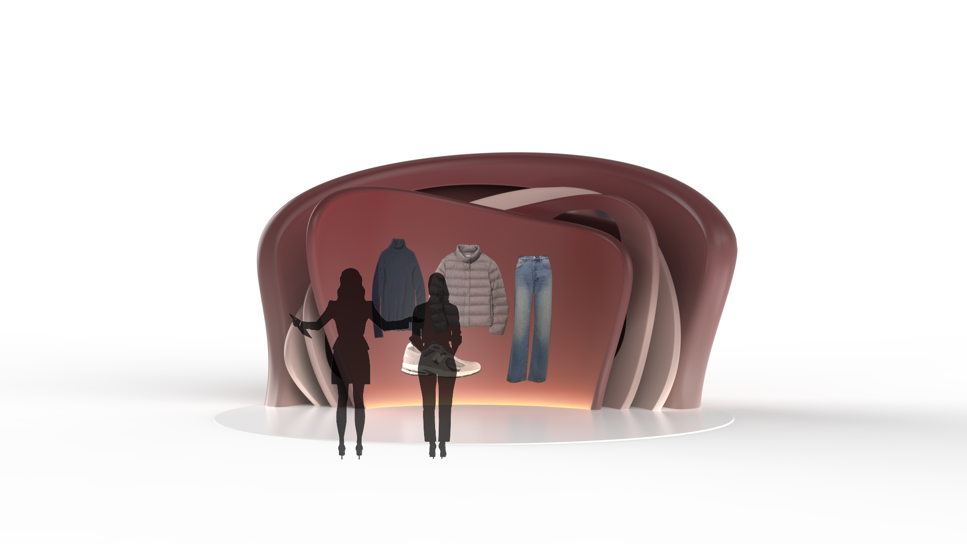 Lighting, sound, and atmosphere adapt to match the occasion where the outfit will be worn, allowing the customer to step directly into the context of their look.